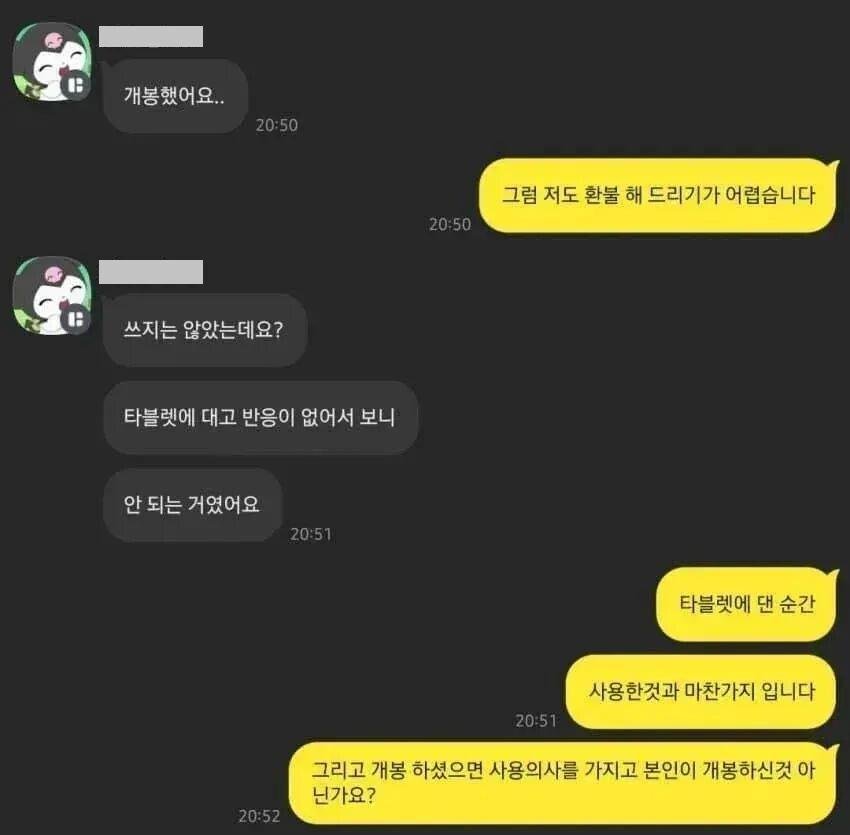 판매자는 사용자의 환불 요구에 대한 논리를 반박하며 대화는 더욱 격렬해졌습니다. 판매자가 언급한 호환 모델과 사용자가 구매 당시의 대화 내용을 둘러싼 이견들은 사건을 복잡하게 만들고 있습니다. 누가 잘못했는지, 누구에게 책임이 있는지 조차 분명하지 않은 상황에서, 이번 사건은 사기죄와 같은 심각한 법적 문제로 비화될 조짐을 보이고 있습니다.