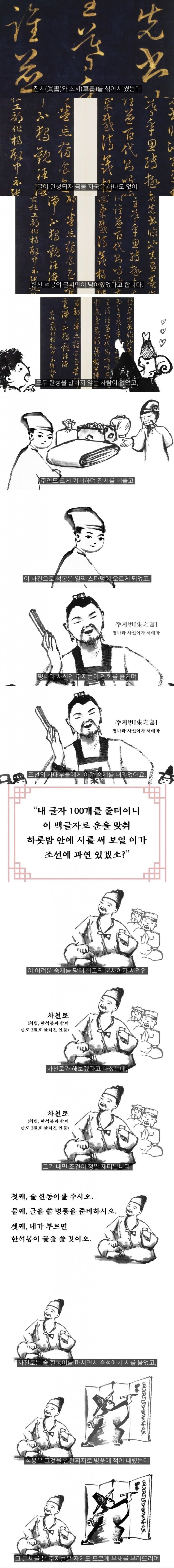 한석봉이 명필로 거듭나게 된 과정은 그야말로 드라마틱하였습니다. 비록 그는 과거시험에서 급제하지 못했지만, 그의 뛰어난 필력은 모두의 눈을 사로잡았습니다. 그는 승정원의 사자관으로 임명되면서 점차 대외적으로 이름을 날리기 시작했습니다. 특히나 그의 명성을 높인 사건 중 하나는 바로 명나라의 한 대부자가 주최한 잔치에서 발생했습니다.