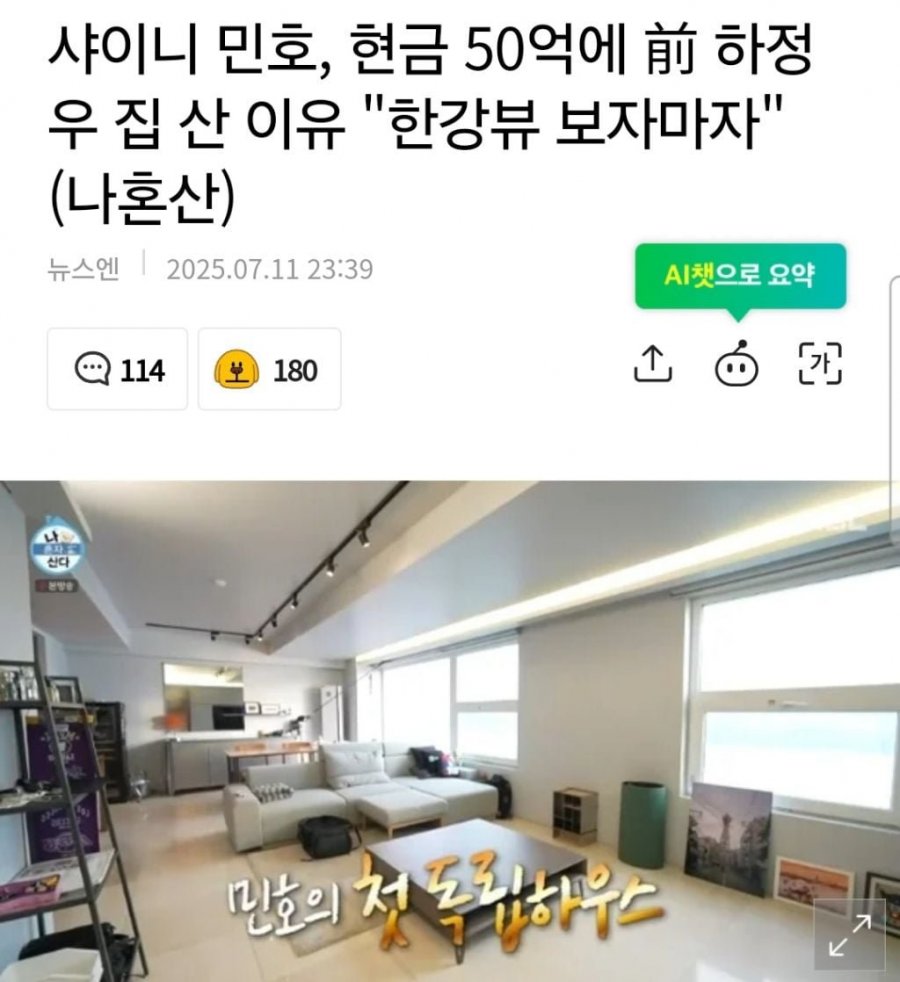 샤이니의 민호가 최근 하정우의 집을 무려 50억 원에 구입해 화제를 모으고 있다! 이 놀라운 결정의 배경에는 한강을 한눈에 담을 수 있는 경치 좋은 뷰가 있었다고 전해진다. 민호는 "한강뷰를 보고 바로 마음이 빼앗겼다"며 현명한 선택을 한 이유를 밝혔다.