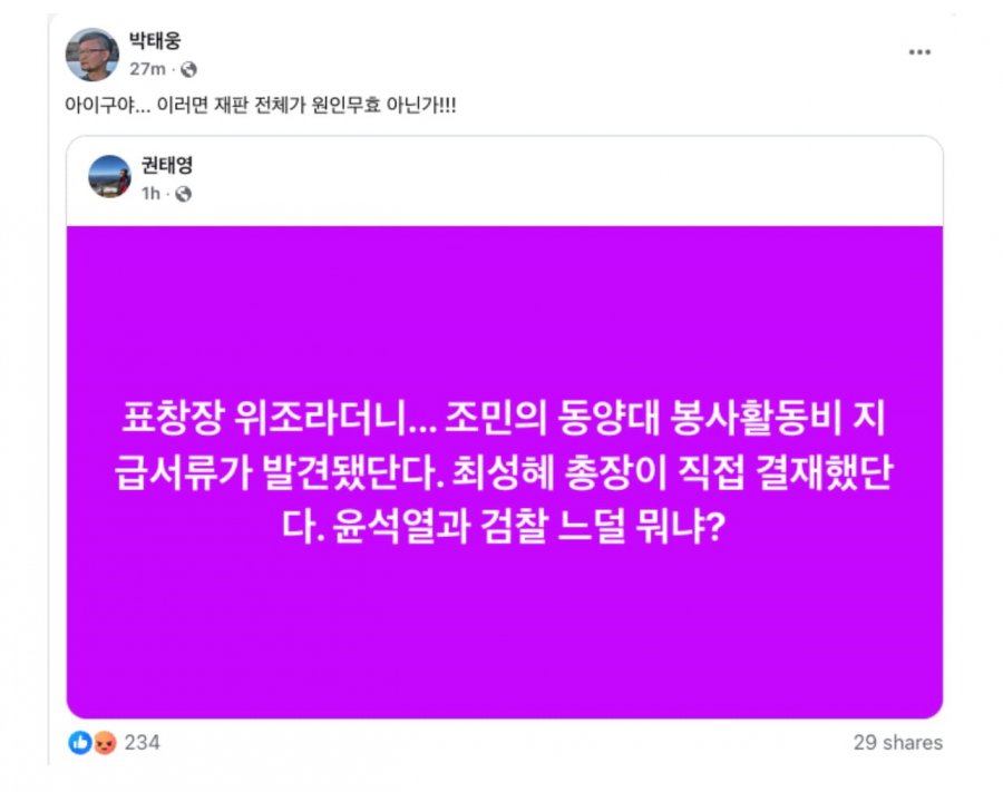 한영외고와 고려대 의전원을 나온 멀쩡한 여의사가 하루아침에 고졸 박태웅으로 몰려버리는 믿기 힘든 일이 벌어졌다! 이것이 사실이라면 재판 전체가 원인무효가 되는 것 아닌가! 권태영은 불과 한 시간 전, 표창장 위조라는 혐의를 받고 있었다. 그런데 만약 조민의 동양대 봉사활동비 지급 서류가 발견되었다면 상황은 더욱 복잡해진다! 이번에 최성혜 총장이 직접 결재했다는 사실은 이를 더욱 화제의 중심에 놓고 있다. 과연 윤석열과 검찰은 이 사건에 대해 무엇을 할 것인지, 그들의 역할은 무엇인지 궁금증이 증폭되고 있다. 지금 이 상황은 234명이 공유하며 뜨거운 관심을 받고 있다! 이게 과연 진실인지, 아니면 그저 소문에 불과한 것인지, 세상은 주목하고 있다!