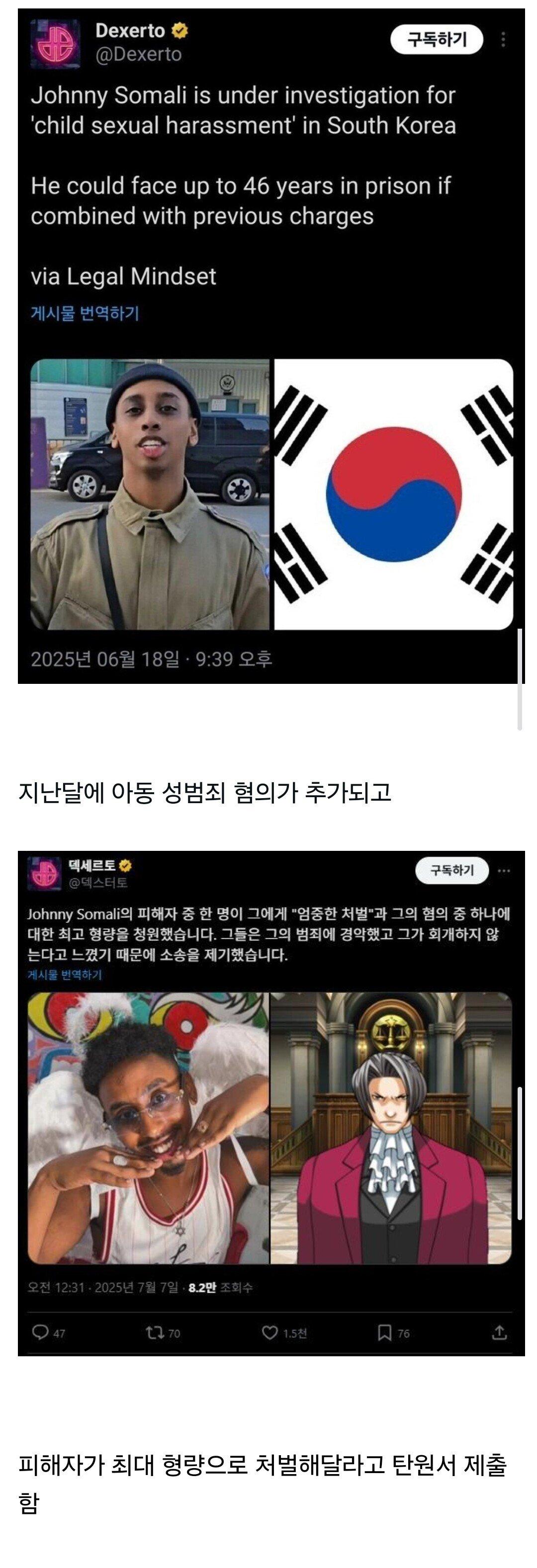 조니 소말리가 한국에서 '아동 성적 괴롭힘' 혐의로 조사받고 있으며, 이전 혐의와 결합될 경우 최대 46년의 징역형에 처해질 수 있다는 shocking 소식이 전해졌다. 이는 한국 사회에 큰 충격을 주고 있으며, 피해자 중 한 명은 그에 대해 "엄중한 처벌"을 청원하는 탄원서를 제출했다고 한다.