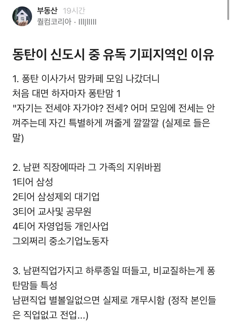 동탄, 이곳이 신도시 가운데 유독 기피 지역으로 떠오른 이유는 무엇일까요? 최근 한 주민의 목격담에 따르면, 동탄의 맘카페 모임에서 벌어지는 생생한 이야기가 전해지고 있습니다. 첫 번째 이야기는 바로 전세와 자가의 문제인데, 한 맘이 "자기는 전세야, 자가야? 전세? 어머 모임에 전세는 안 껴주는데 자긴 특별하게 껴줄게"라는 말로 시작됐다고 합니다. 이 말 한마디로 분위기가 후끈 달아오르며, 전세 맘은 일순위로 무시당하는 형국이죠.