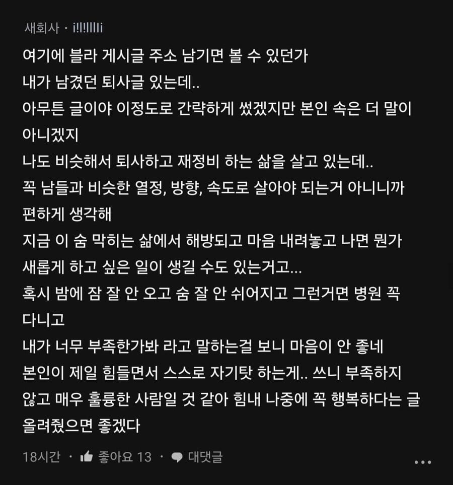 그는 "교통사고가 나서 한숨 돌리고 싶다"는 극단적인 생각도 했으며, 그의 마음 속 상처가 날이 갈수록 곪아가고 있음을 실감하고 있다. 퇴사가 옳은 선택인지, 아니면 하루라도 더 버티며 돈을 모아야 할지를 하루 종일 고민하지만, 결론이 나지 않아 불안한 일상을 이어가고 있다.