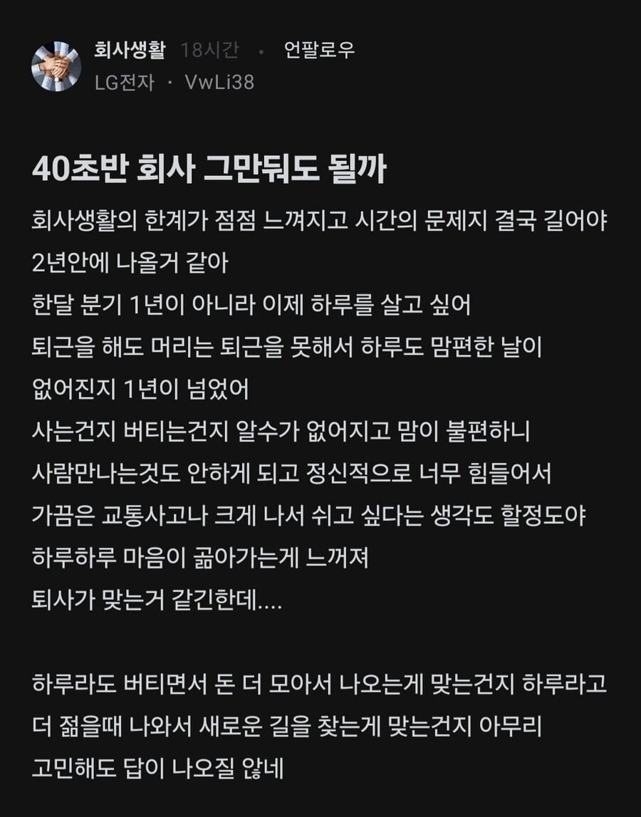 40대 초반의 직장인이 퇴사 고민에 휩싸인 가운데, 그의 불행한 회사생활 이야기가 밝혀졌다. 매일 18시간을 일하며, 그는 LG전자를 언팔로우한 후 스스로의 삶을 되돌아보았다. "더는 견딜 수 없다"는 그의 고민은 깊어만 갔고, 그는 이제 하루를 살아가는 것이 목표라고 말했다. 퇴근을 해도 머릿속은 퇴근하지 않아 마음의 평화를 잃고, 사람들과의 관계마저 단절되었다고 전했다.