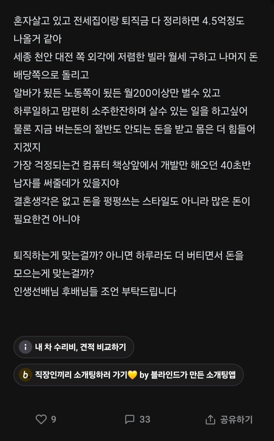 그는 혼자 살고 있으며, 4.5억 원 정도의 자산을 바탕으로 세종, 천안, 대전 외곽에 저렴한 빌라를 얻고, 나머지 돈은 배당으로 돌리려는 계획을 세우고 있다. 그는 월 200만 원 이상의 수입으로 하루 일하고 마음 편히 소주 한잔을 즐기는 삶을 꿈꾸고 있으나, 현재의 절반도 안 되는 돈을 받을까 두려워하고 있다.