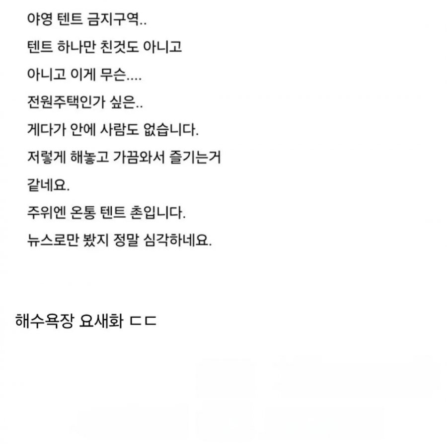 시민들은 "주말마다 이곳에 오지만, 안에는 아무도 없다"며 불만을 토로했습니다. 사람들은 이곳을 '텐트촌'이라고 칭하며, 그야말로 해수욕장이 아닌 별천지를 방불케 하는 상황이라고 주장하고 있습니다. 과거에 보도된 적이 있지만, 지금의 심각성은 뉴스로만 접했던 그 이상이라는 것이죠!