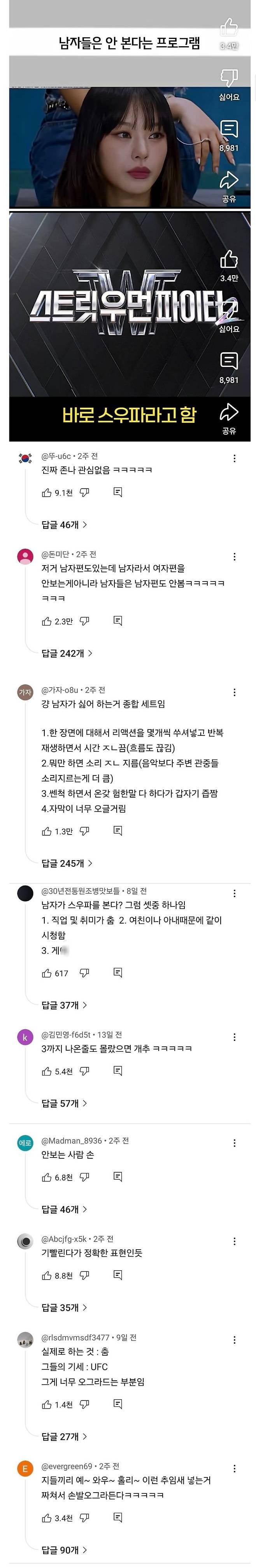 한 누리꾼은 "남자편도 있지만, 차라리 여자편을 안 보는 것이 아니다. 남자들은 아예 남자편도 안 본다!"라고 주장하며 화제를 모았다. 또 다른 댓글에는 "그냥 남자들이 싫어하는 요소가 종합적으로 모여 있는 프로그램이다"라며 세 가지 이유를 정리했다. 첫째, 장면 리액션이 여러 번 반복되어 흐름을 방해한다는 것. 둘째, 음악보다 관중의 소리 지름이 더욱 크게 느껴진다는 점. 셋째, 험한 말을 쏟은 뒤 갑자기 귀여운 척한다는 것이었다.