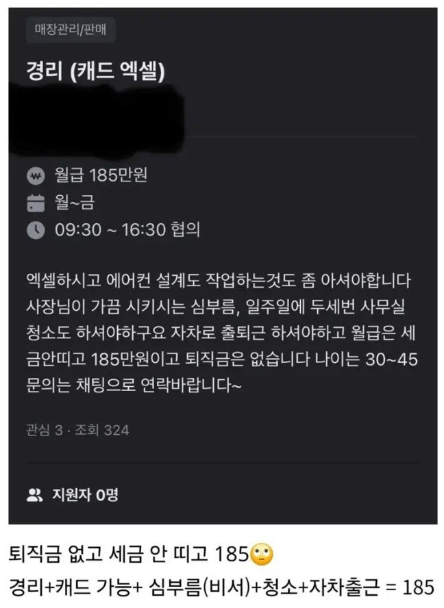 무려 185만 원의 월급이지만, 세금이 안 떼어지고 퇴직금 역시 없다고 한다. 30대에서 40대까지 지원 가능하다고 하니, 이 묘한 조합의 일을 멋지게 소화할 누군가가 나타날 수 있을지 주목된다. 과연 누가 이 직무의 주인공이 될 것인가? 지원자는 0명, 조회수는 324회라는 충격적인 통계까지! 관심이 있다면 채팅으로 연락하라고 하니, 대기하고 있는 지원자가 없다면 회사 입장에서는 괜찮을지 의문이다! 이 놀라운 경리 직무의 미래는 과연 어떻게 될 것인가?