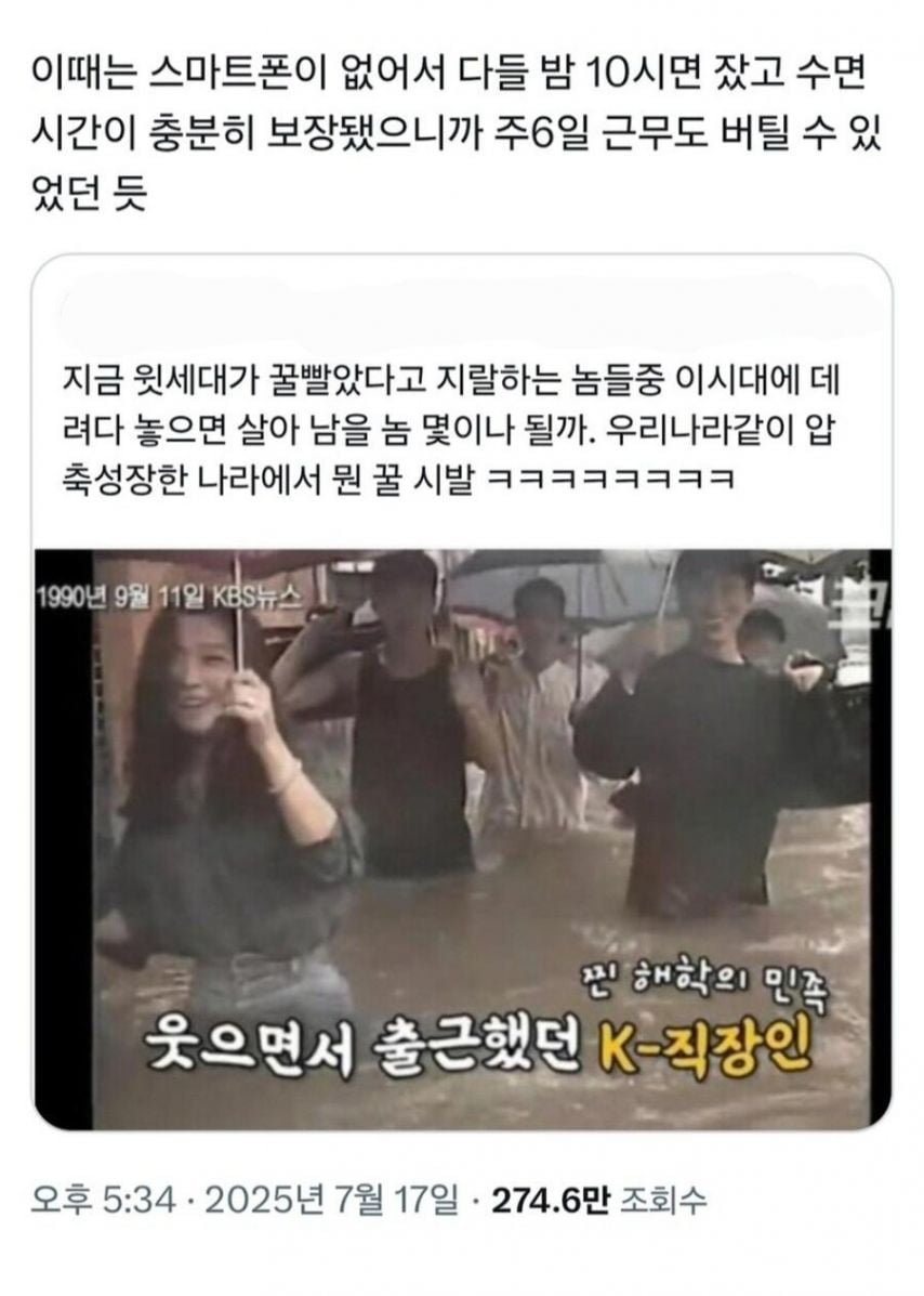 1990년 9월 11일에는 KBS 뉴스에서 웃음을 잃지 않는 K-직장인들이 소개되었으며, 이들이 하루를 마치고 돌아오는 모습은 정말로 특이한 광경이었다고 한다. 시간이 지나도 여전히 사람들은 그 시절의 이야기를 잊지 않고, 그리운 기억으로 간직하고 있는 듯하다. 그러나 과거가 너무 달콤하게 느껴지자, 지금은 또 다른 방식으로 삶을 고민해야 할 시간인지도 모르겠다!