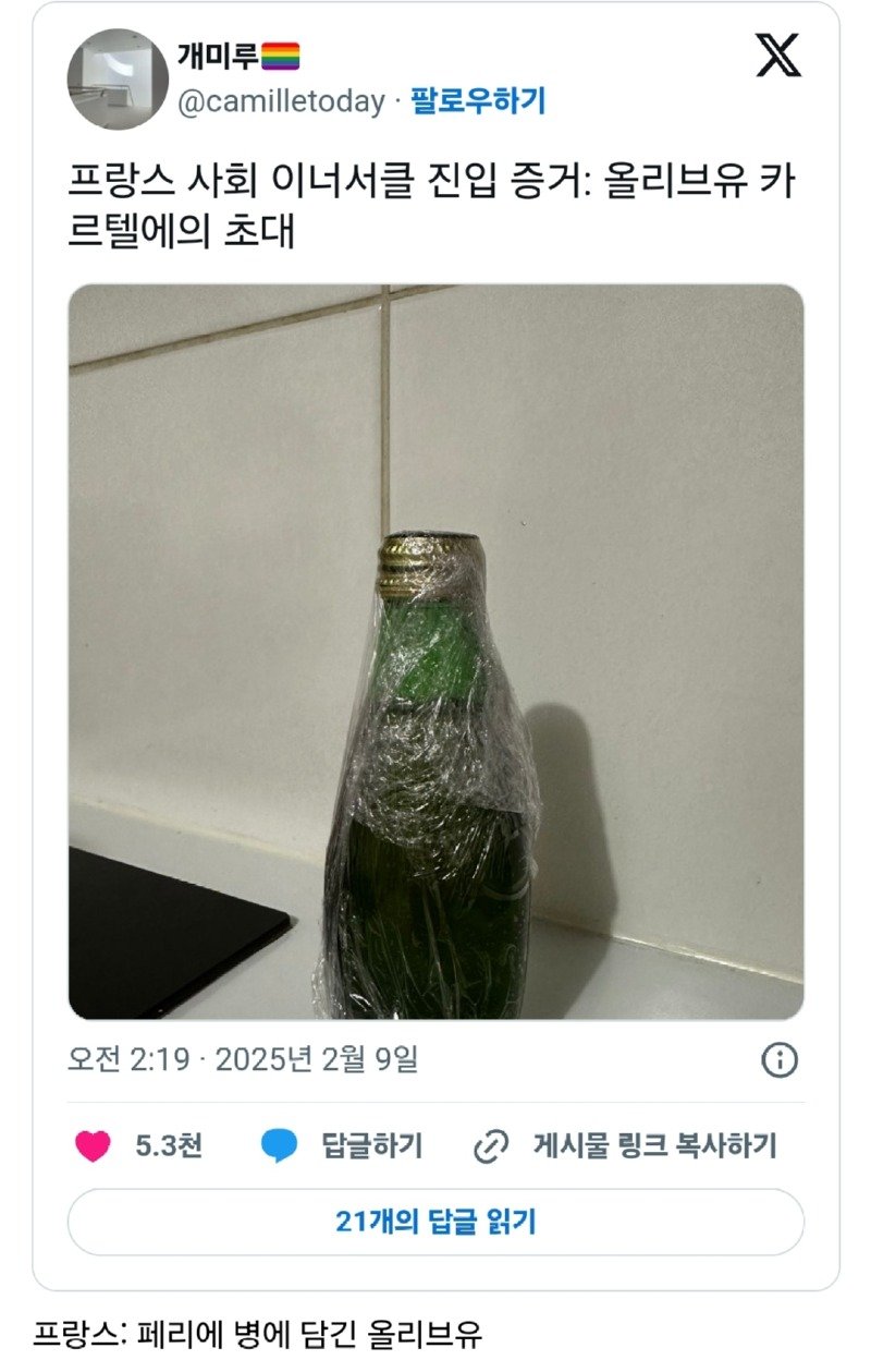 프랑스 역시 다르지 않다. 그 나라의 이너서클에 진입한 사람은 특별한 올리브유 한 병을 통해 그들의 엘리트 사회에 들어설 수 있다는 이야기! 한 사용자가 심지어 "2:19에 올리브유 카르텔에 초대받았다"며 자신의 경험을 공유했다.