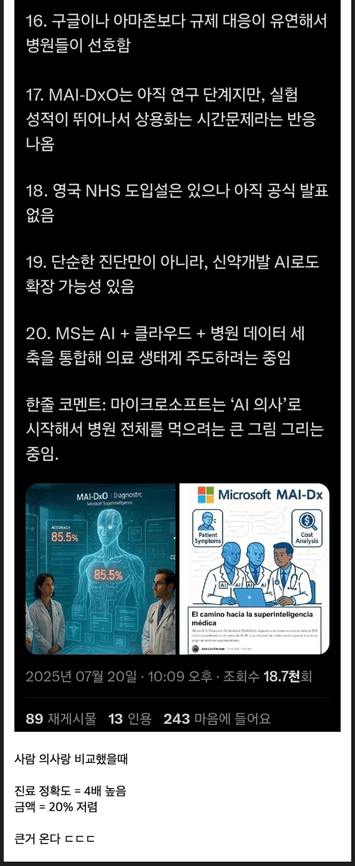 MAI-DxO는 챗GPT처럼 단일 시스템이 아닌, 마치 전문가 팀처럼 각각의 역할을 나눠서 작동합니다. 가설을 세우는 봇, 검사 제안하는 봇, 심지어 반박하는 봇까지 등장해 서로 토론하며 최종 결론을 도출합니다. 놀라운 점은, 실제 검사를 하지 않고도 절반 이상의 정확도로 진단을 맞추며, 실제 검사를 진행하더라도 인간 의사보다 20% 저렴한 비용으로 진단을 진행할 수 있다는 것입니다.