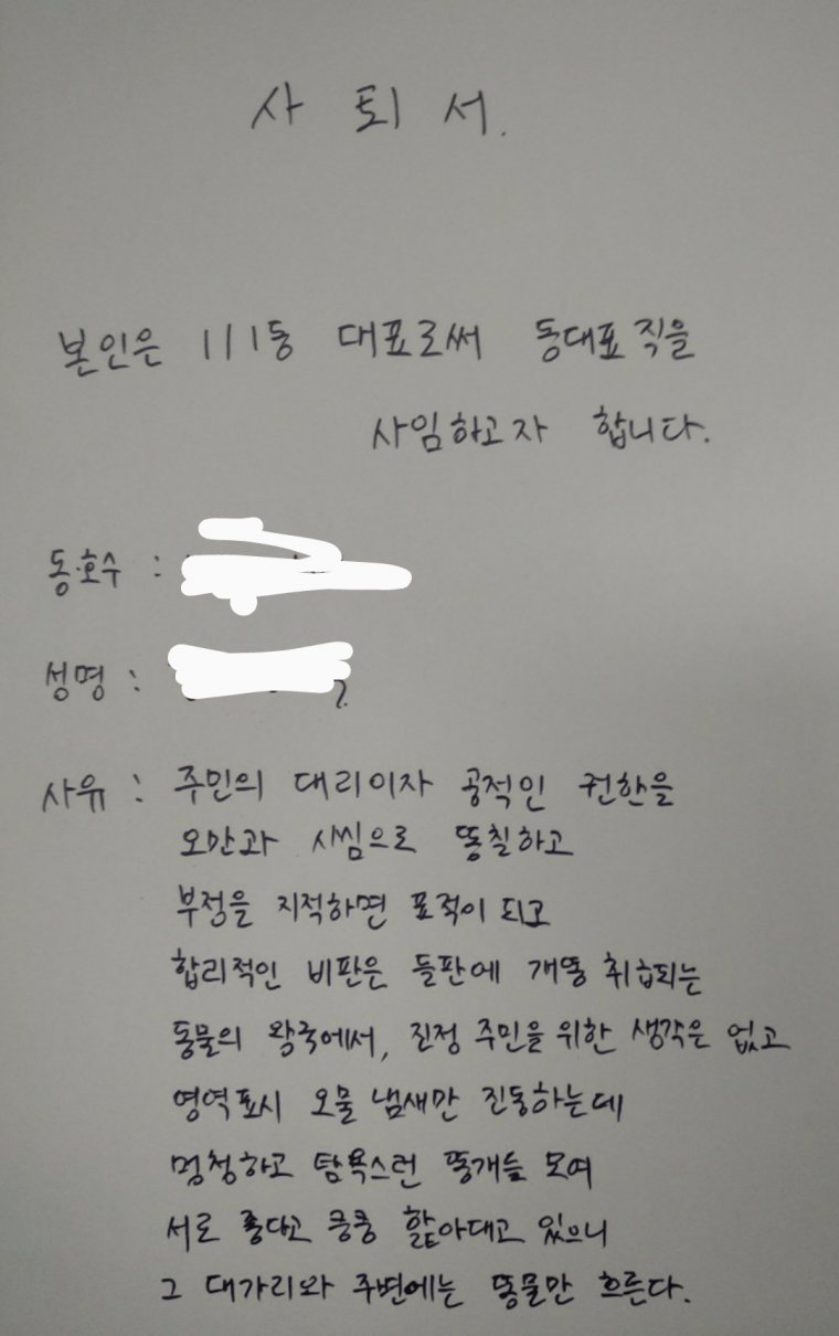 어느 아파트 동대표가 충격적인 사퇴서를 제출했다. 111동의 대표로서 직무를 사임하겠다는 그는 자신이 속한 아파트 커뮤니티의 어두운 진실을 폭로하며 비난의 화살을 날렸다. 그는 주민들을 대표하는 공적인 권한을 가지고 있으면서도 그 권한을 오만하게 남용하고 있다고 주장하며, 부정적 의견을 내는 주민들은 표적이 되었고, 합리적인 비판은 마치 들판에 버려진 개똥처럼 취급되고 있다고 목소리를 높였다.