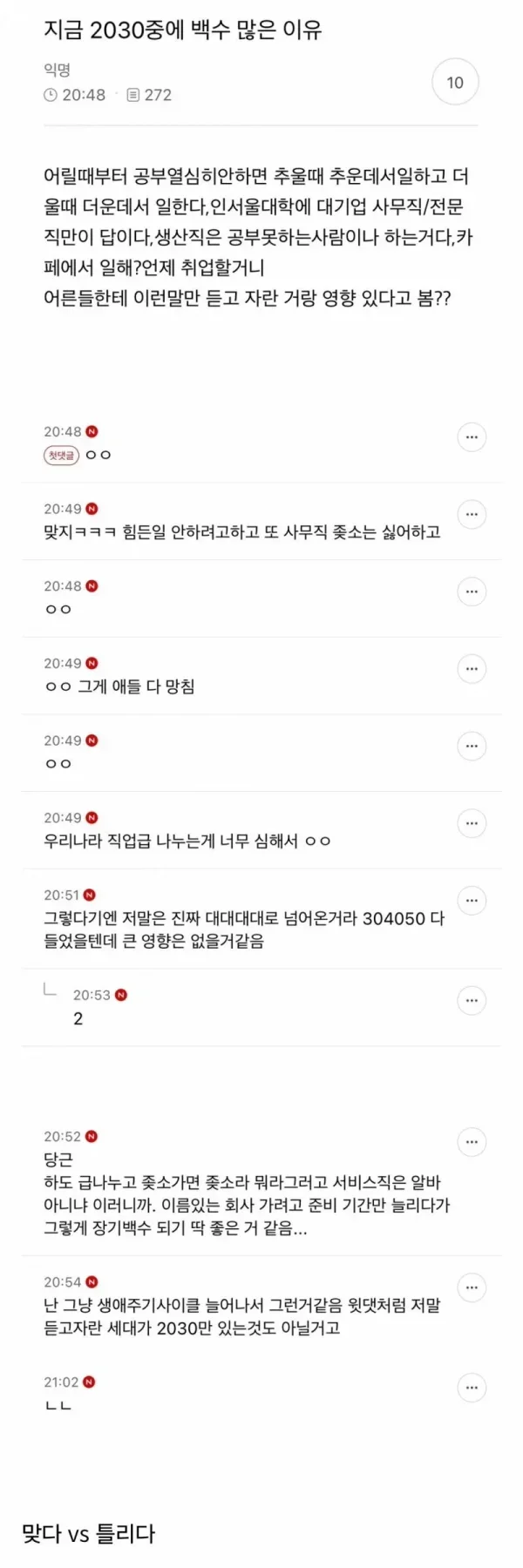 2030 세대의 백수 문제가 심각한 상황에 직면했습니다! 이 젊은이들은 왜 취업에 어려움을 겪고 있는 걸까요? 한 익명의 게시자는 "어렸을 때부터 공부를 열심히 하지 않으면 차가운 겨울 날씨에 밖에서 일하게 되고, 더운 여름에도 힘든 일을 해야 한다"며, 인서울 대학을 졸업하고 대기업의 사무직이나 전문 직종 외에는 나쁜 미래가 기다리고 있다고 신랄하게 비판했습니다.
