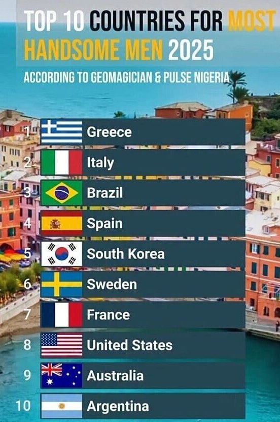 2025년, 세상에서 가장 미남들이 많은 국가가 공개되었습니다! 이 충격적인 결과는 유명 데이터 분석 업체인 지오매지션과 펄스 나이지리아의 연구를 통해 드러났습니다. 그들은 놀랍게도 그리스, 이탈리아, 브라질, 스페인 등 아름다운 얼굴을 자랑하는 다수의 나라들을 순위에 올려놓았습니다! 하지만 그 중에서도 우리나라, 대한민국이 이 리스트에서 강력한 존재감을 드러냈습니다.