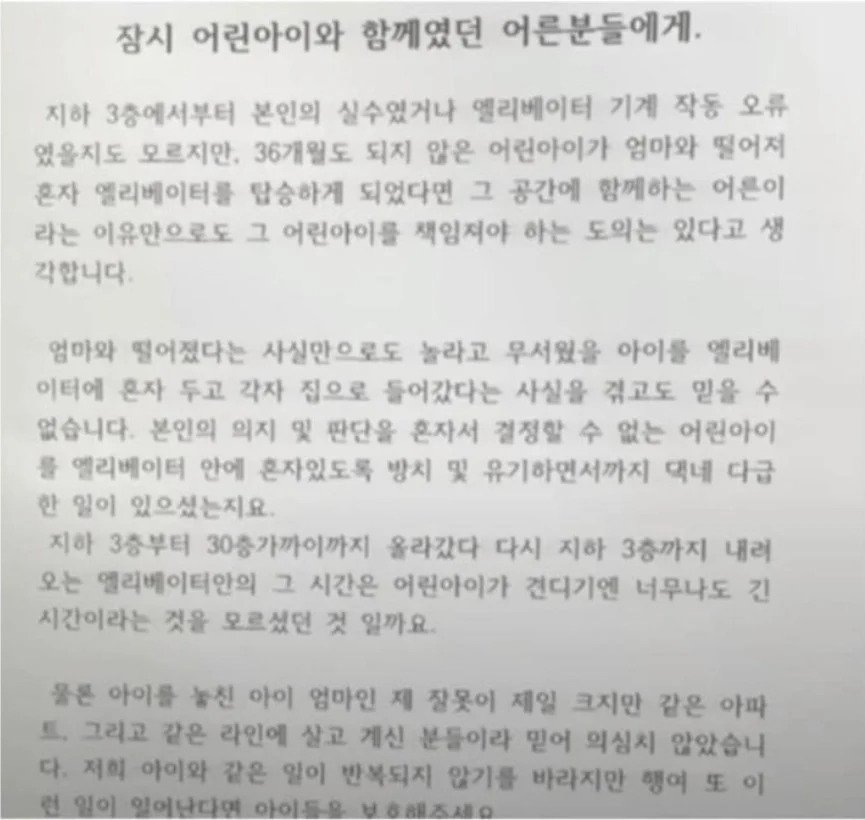 엘리베이터에서 홀로 남겨진 36개월의 어린아이에 대한 충격적인 사건이 발생했습니다. 최근 한 아파트에서, 어린아이는 보호자와 떨어져 혼자 엘리베이터에 탑승하게 되었고, 이 모습을 지켜본 주변 어른들은 아무런 조치를 취하지 않았습니다. 하지만 과연 누가 이 아이를 책임져야 할까요?