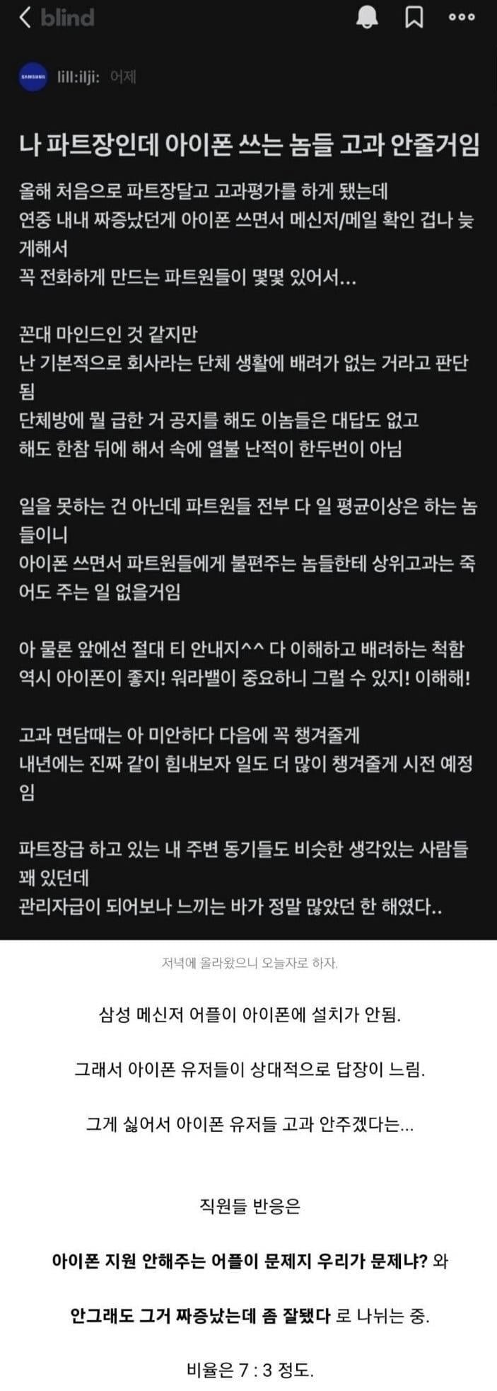 동료 관리자들과의 대화에서도 비슷한 의견이 나오고 있으며, 파트장의 SNP(Samsung Negative Perception) 발언은 직장에서의 모럴 해저드와 편견의 문제를 드러내고 있다고 전문가들은 분석하고 있다. 삼성 메신저가 아이폰에서 설치되지 않기 때문에, 대화 속도에 차이가 난다는 점도 큰 문제로 떠올랐다.