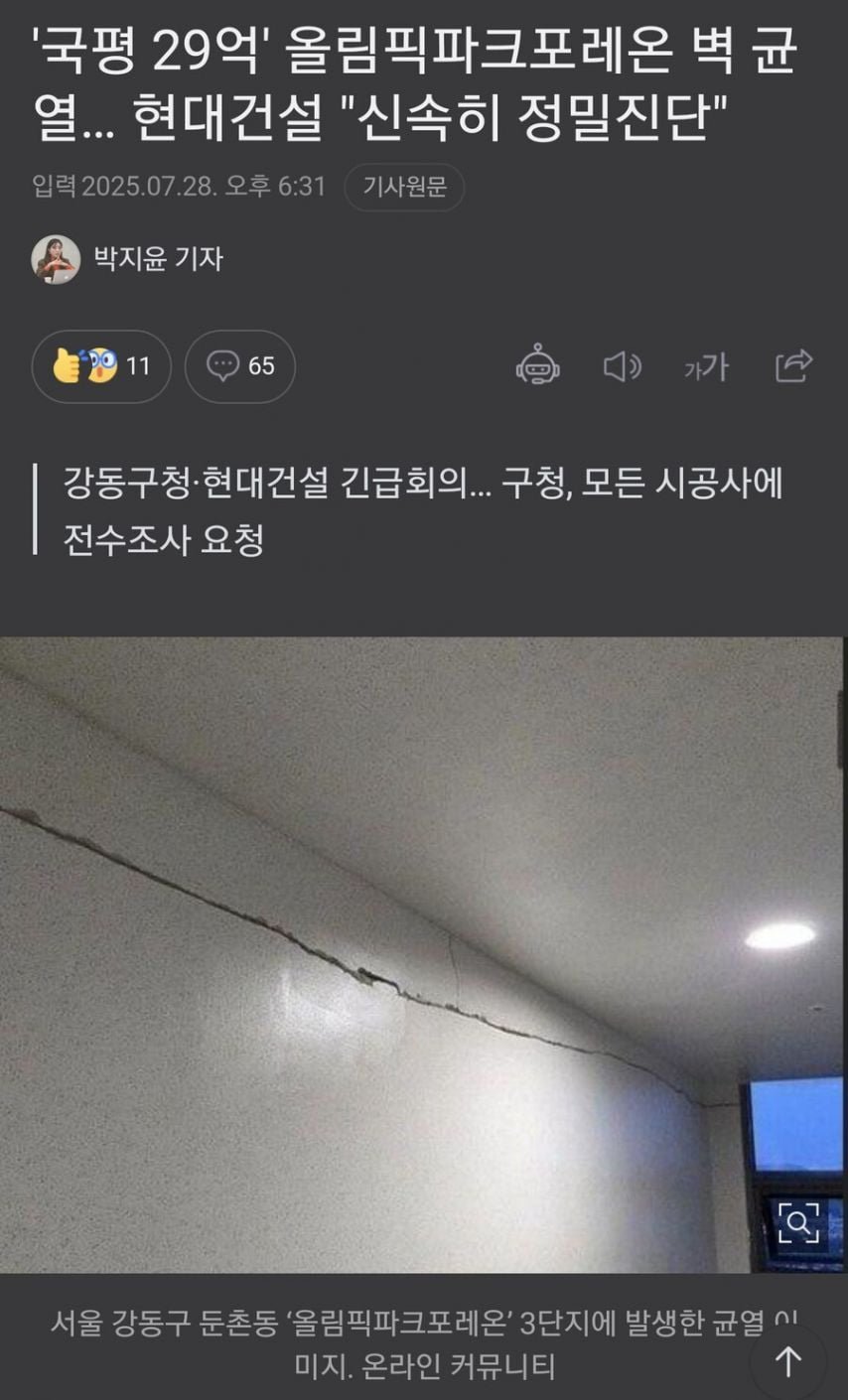 현대건설이 이 아파트의 시공을 맡았지만, 이제는 그들이 문제가 부풀어 오르지 않도록 빠르게 정밀진단을 실시하겠다고 약속했다. 강동구청 역시 긴급 회의를 소집하고 모든 시공사에 대한 전수조사를 지시하며 대응에 나섰다.