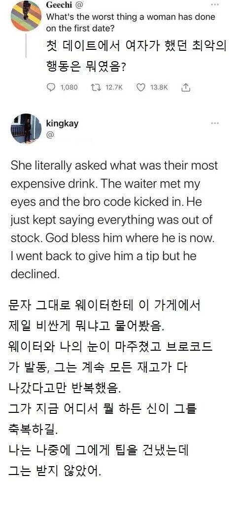 이런 불행한 상황에도 불구하고, 어떤 이유에서인지 그 웨이터는 지금도 최고로 축복받고 있다고 전해진다. 그리고 이 이야기는 모든 데이트 관련 커뮤니티에서 논의되고 있으며, 앞으로의 첫 데이트가 어떤 위험을 내포하고 있을지 궁금증을 자아내고 있다!