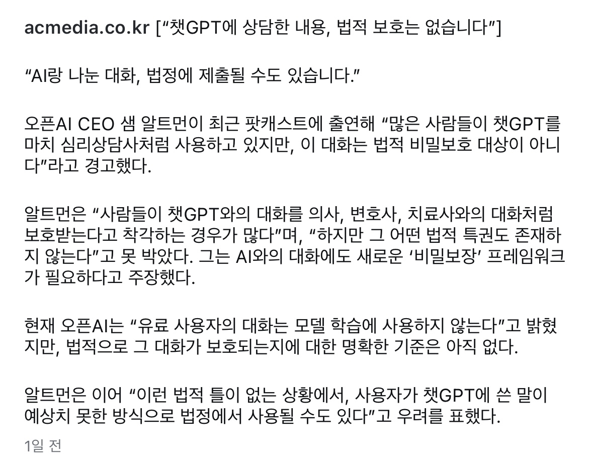 특히, 알트먼은 “어떤 법적 특권도 존재하지 않는다”며, 사용자가 챗GPT에게 남긴 말이 예기치 못한 순간에 법정에 제출될 수도 있음을 경고했다. 오픈AI는 “유료 사용자의 대화는 모델 학습에 사용되지 않는다”고 밝혔지만, 이러한 대화가 법적으로 어떻게 보호될지가 여전히 불확실하다는 점이 문제다.
