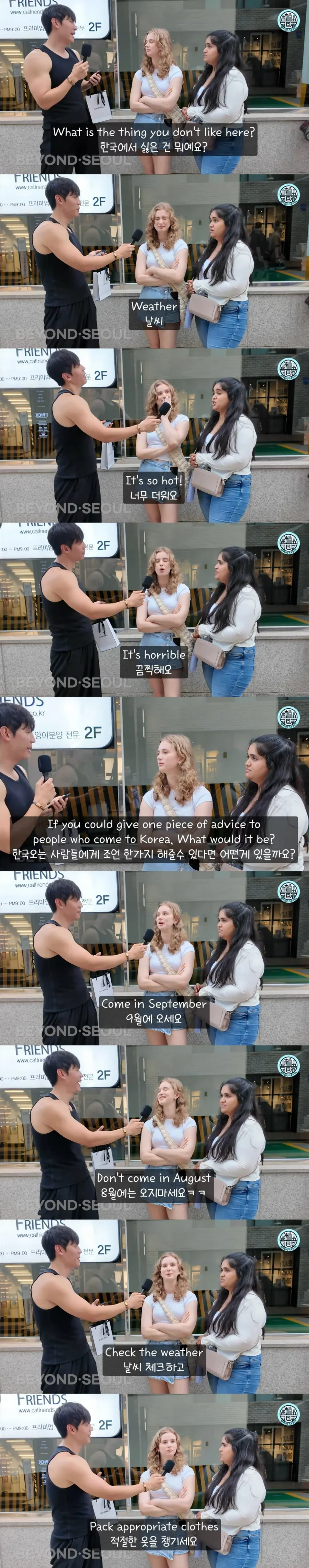 특히, 한국을 방문하려는 외국인들에게 조언을 요청했을 때, 그녀는 “절대 8월에는 오지 마세요!”라며 경고했다. 한국의 덥고 습한 여름은 누구에게나 지옥 같은 경험이 될 수 있다는 것이다. 반면, "9월에 오세요!"라는 조언도 잊지 않았다.