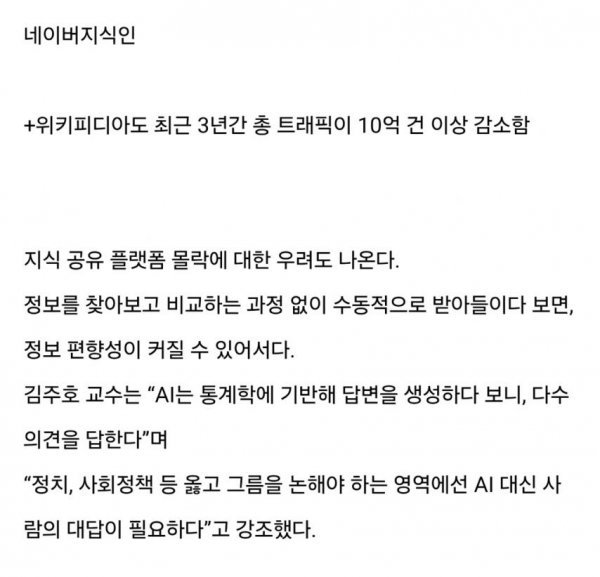 김주호 교수는 "AI가 통계학에 기반해 답변을 생성하는 이 시대에, 정치적 또는 사회적 이슈에 대해선 여전히 인간의 의견이 필요한 상황"이라고 강조했다. 그는 AI 대신 사람의 대답이 요구된다고 주장하며 사용자들의 불만을 담았다. 실제로 많은 이용자들은 "지식이 없고 비전문가의 말로 도배된 내용이 너무 많고 광고 역시 지겹다"는 비판을 쏟아내고 있다.