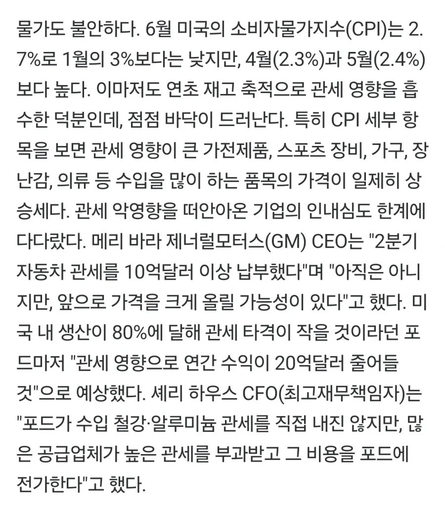 특히 가전제품, 스포츠 장비, 가구, 장난감, 의류 등의 가격은 관세의 직격탄을 맞으며 일제히 오름세를 타고 있다. 수입에 의존하는 기업들의 인내심도 끝을 향해 가고 있다. 제너럴모터스(GM)의 메리 바라 CEO는 "2분기 동안 자동차 관세로 10억 달러 이상을 납부했다"며 가격 상승에 대한 암울한 경고를 날렸다. 가격 인상이 아직 발생하지 않았지만, 앞으로는 극적인 인상이 예고되고 있다.