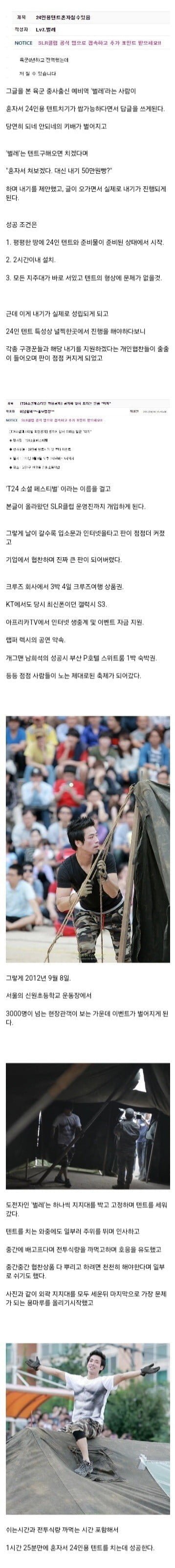 기대감이 고조되며, 사건은 빠르게 전개됐다. 각종 댓글이 쏟아지며 '안 된다', '된다'의 대립이 치열해졌다. 그러나 '벌레'는 이를 기회로 삼아 혼자서 텐트 치기를 시도하기로 결심했다. 조건은 간단했다. 평평한 땅에서 24인용 텐트를 준비하고, 2시간의 시간 내에 성공해야만 했다.