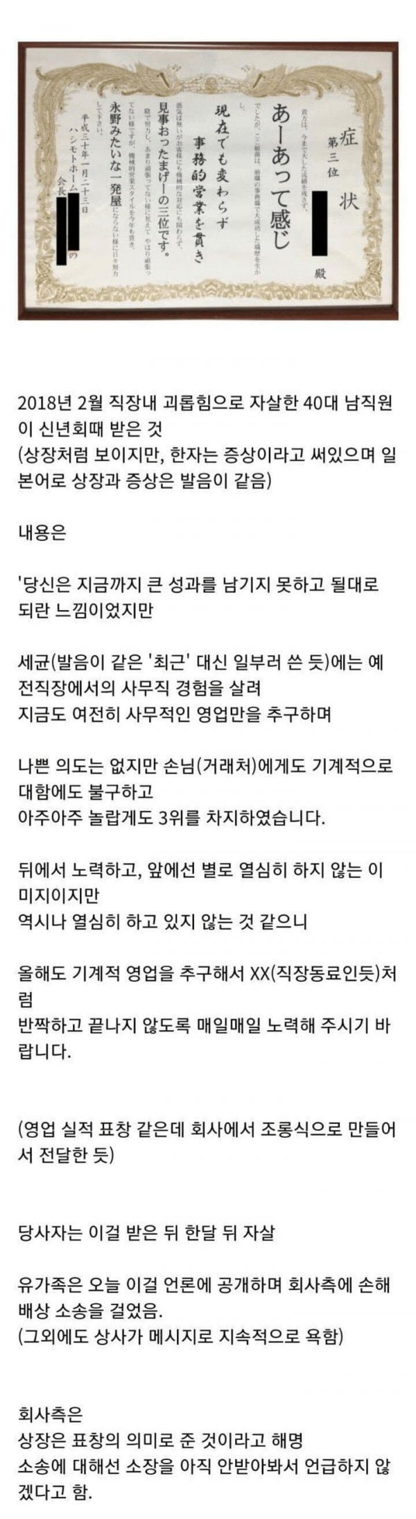 일본에서 자살한 직장인이 자살 직전 받은 상장.jpg