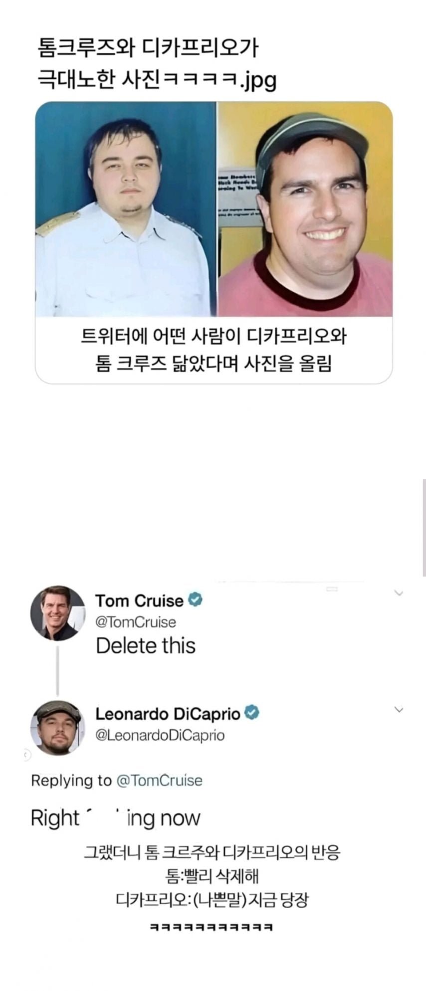 해외 유명인들을 분노하게 만든 충격적인 사건이 벌어졌다! 한 트위터 사용자, 그의 이름은 밝혀지지 않았지만, 톰 크루즈와 레오나르도 디카프리오의 얼굴을 합성한 사진을 올리며 두 스타의 커다란 화를 자아냈다. 톰 크루즈는 즉각적으로 "이 사진 삭제해!"라고 일갈하며 격분한 반응을 보였고, 이는 곧바로 디카프리오에게 전달되었다. 디카프리오는 "지금 당장 삭제해라, (나쁜말)!"라고 불같은 반응을 보이며 상황은 극도로 긴장감이 감돌았다.