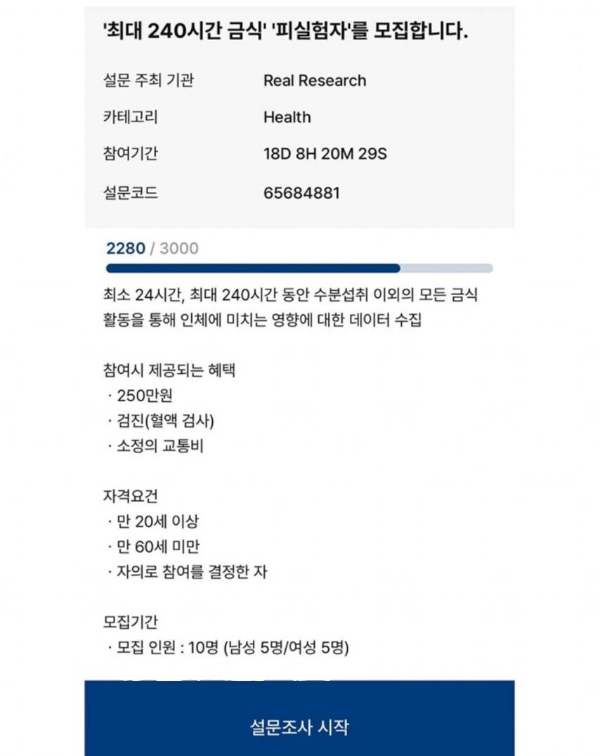 “최대 240시간 금식”이라는 충격적인 문구가 적힌 포스터가 온라인을 휩쓸고 있다! 여러분, 어떤 제안이 이렇게 기이하고 극단적인 방식으로 우리의 관심을 끌 수 있을까? 바로 ‘Real Research’라는 의문의 기관이 진행하는 긴급 피실험자 모집 공고 때문이다. 참여자들은 무려 250만원의 현금을 받을 수 있는 기회를 얻는다는데, 그 대신 그들이 해야 할 일은 단순한 설문조사가 아니다. 바로 24시간에서 최대 240시간까지 금식하며 인체에 미치는 영향을 자극적으로 조사하는 것이다!