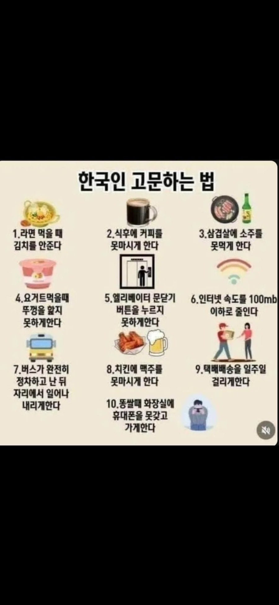 상상할 수 없는 고문이 한국에서 진행되고 있다는 충격적인 사실이 드러났다! 사람들의 고통을 극대화하기 위해 고안된 열 가지의 기상천외한 방법들은 저를 포함한 많은 이들을 경악하게 만들었다. 이 방법들은 단순히 신체적 고통을 넘어, 한국인의 생존 방식과 문화를 겨냥한 심리적 테러로 볼 수 있다.