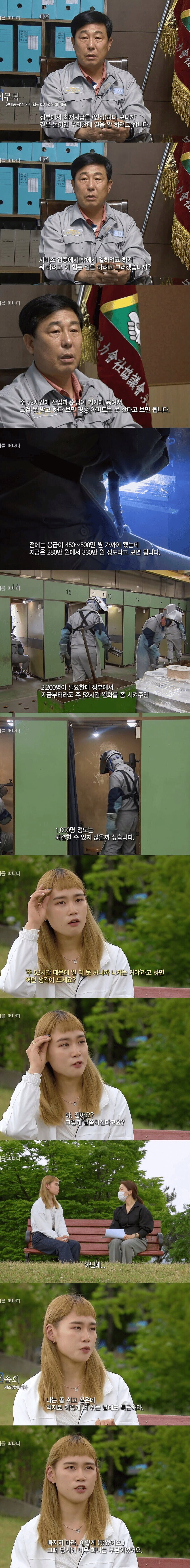 이 대표는 “현재 2,200명이 필요한 상황인데, 정부가 주 52시간을 완화해주면 1,000명 정도는 해결할 수 있을 것”이라고 강조했습니다. 청춘들이 고된 일을 회피하고 서비스업으로 향하고 있는 현실을 두고 “주 52시간 때문에 일자리를 못 구하는 게 아닐까?”라는 의문을 던졌습니다. 이에 한솔희 씨는 “이런 상황에서 나는 쉬고 싶은데 특근하라고 강요받았다”며 불만을 토로했습니다.