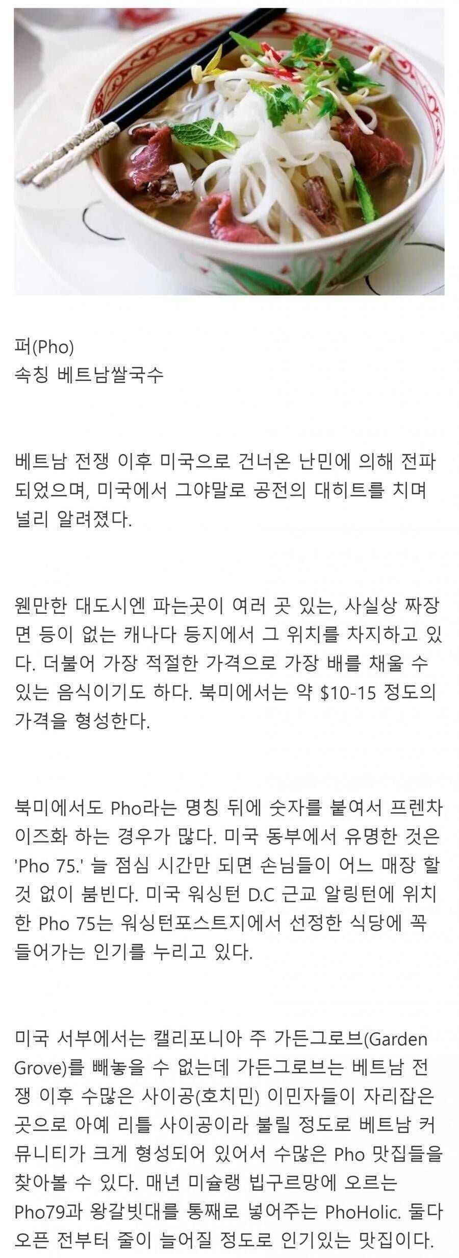 미국에서 대박난 아시아 음식, 바로 베트남 쌀국수! 이 요리는 베트남 전쟁 이후 난민들에 의해 미국으로 전파되며, 그야말로 엄청난 인기를 끌고 있다. 이제 미국의 거의 모든 대도시에서 보편적으로 찾아볼 수 있는 이 쌀국수는, 심지어 캐나다 같은 나라에서는 짜장면의 자리를 차지하고 있으며, 음식 가격 대비 배를 꽉 채울 수 있는 최고의 선택지로 자리잡았다. 북미에서의 가격은 대체로 10달러에서 15달러 사이로 형성되고 있다.