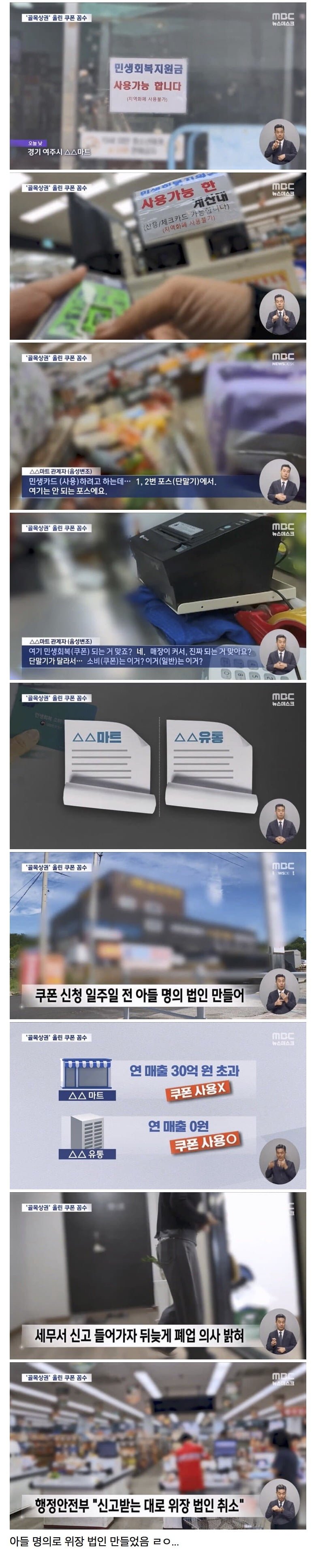 더욱 충격적인 것은 이 마트가 쿠폰 사용을 위해 아들이 명의로 위장 법인을 만들어냈다는 사실입니다. 마트의 연매출이 30억을 초과하는 만큼 쿠폰 사용이 불가능한 상황에서, 연매출 0원인 위장 법인을 통해 쿠폰 사용의 편법을 시도했다는 것입니다.