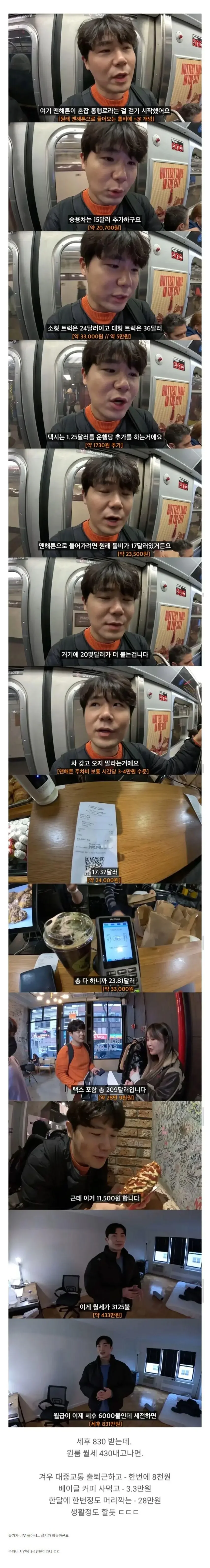 한 달에 주거비로서 3125달러, 즉 약 433만원이 나가고, 세후 월급이 6000달러라 쳐도 세전으로 따지면 실질적으로 손에 쥐는 돈은 겨우 831만원. 이 모든 금액을 감안하면, 식비와 대중교통비, 통신비 등을 제외하고는 남는 게 거의 없어 보입니다. 베이글과 커피 한 잔의 가격도 8천원을 넘어가고, 한 달에 한 번 머리를 깎는 데도 3.3만원이 필요합니다. 결국 생활비는 28만원으로 쪼들려 살 수밖에 없는 상황. 과연 맨해튼에서의 삶이 이렇게까지 어려워질 줄이야! 물가는 천정부지로 치솟고, 사람들은 이곳에서 더 이상 행복할 수 없는 건 아닌지 심각하게 고민해야 할 때입니다.
