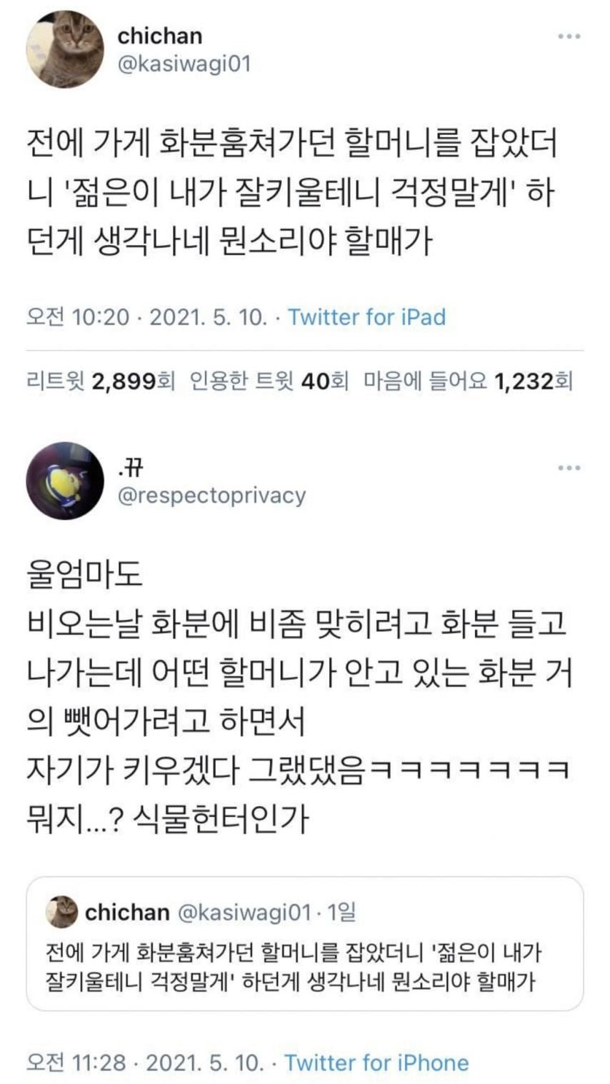 서울의 한 거리에서 믿기 어려운 사건이 발생했습니다! 화초를 훔쳐가던 한 할머니가 경찰에 붙잡혀, "젊은이, 내가 잘 키울 테니 걱정 말라"고 외쳤다는 shocking한 이야기가 SNS를 통해 퍼졌습니다. 한 트위터 이용자는 이 사건을 회상하며, 과거에 어머니가 비 오는 날 화분을 밖에 두려다가 만난 또 다른 할머니가 "내가 키우겠다"며 화분을 빼앗으려 했던 일화를 전했습니다. 이 사건은 수많은 사용자들에게 큰 웃음을 주었으며, “식물헌터”라는 새로운 용어까지 만들어낼 정도로 화제가 되고 있습니다.