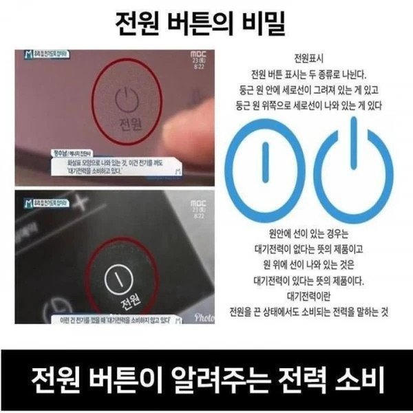 조사에 따르면, 전원 표시가 둥글고 안에 세로선이 그려진 제품은 대기전력을 소비하지 않는 것으로 확인되었습니다. 하지만, 둥글고 위쪽에 세로선이 있는 경우는 조심해야 합니다! 이 제품은 실제로 전원이 꺼져 있어도 적지 않은 양의 전기를 소비하는 것으로 밝혀졌습니다.