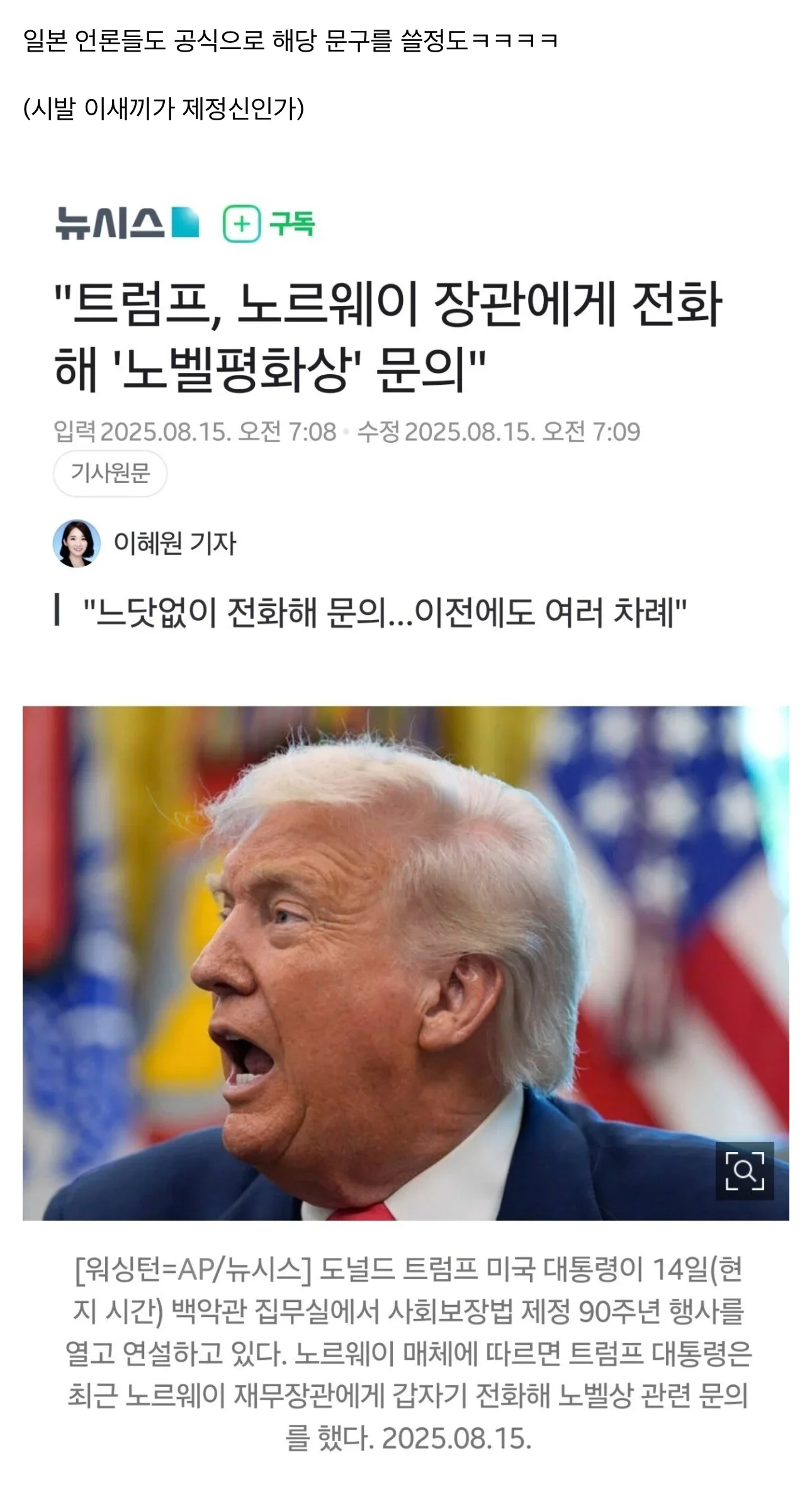 트럼프 대통령은 대체 어떤 생각을 가지고 있는 걸까요? 그가 사회보장법 제정 90주년 행사에서 한 연설 중 노벨 평화상에 대한 의사를 표명한 것과는 별개로, 갑작스런 문의에 침묵을 지키는 노르웨이 측의 반응도 궁금증을 더하고 있습니다. 일각에서는 "정신이 제대로 박힌 건가?"라는 비난의 목소리도 나오고 있습니다.