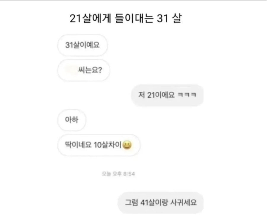 최근 한 온라인 커뮤니티에서 벌어진 충격적인 사건이 화제를 모으고 있다. 31살의 남성이 21살의 여성에게 다가가며 거침없는 대시를 시도한 것이죠. 이 남성은 21살인 그녀에게 "안녕하세요, 저는 31세입니다!"라고 자신을 소개하며 우스꽝스러운 대화를 이어갔습니다.