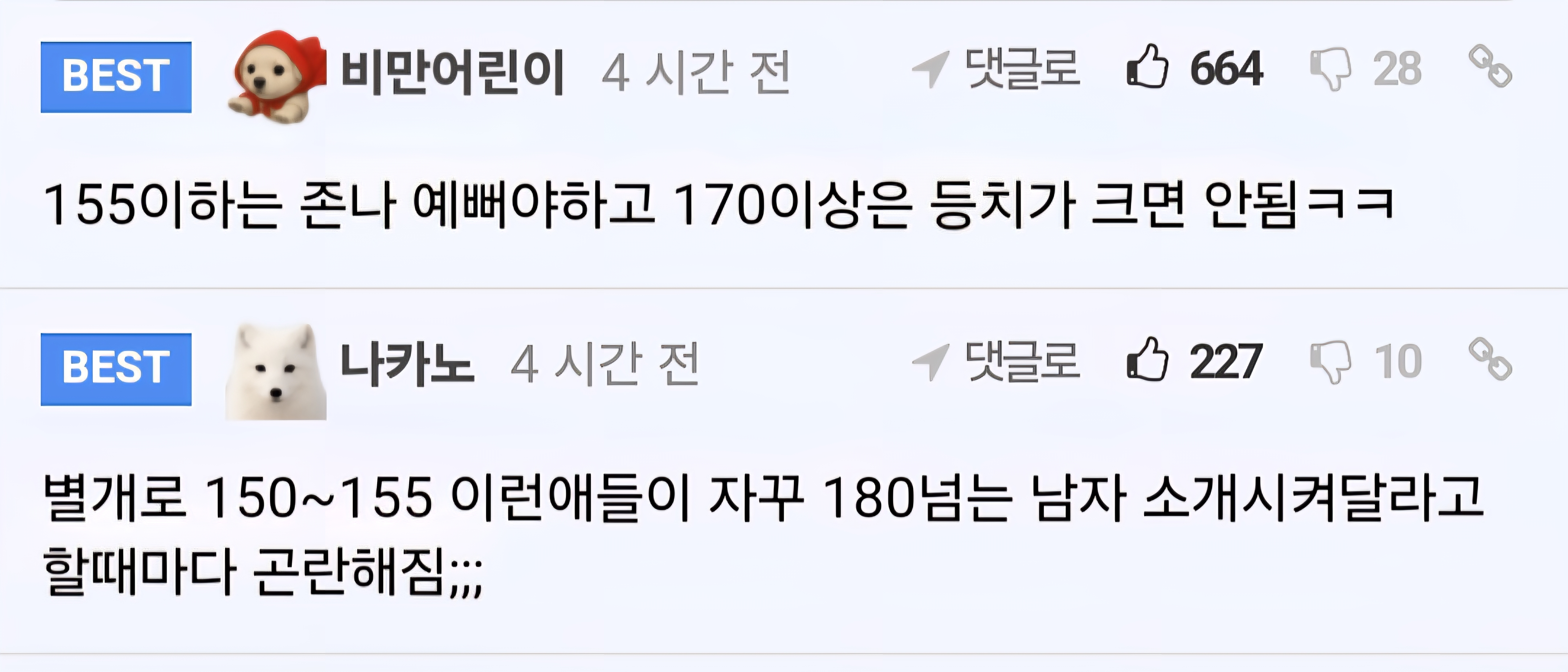 더 놀라운 것은 165~170cm의 여성 또한 "얼굴만 예쁘면 된다"는 무시무시한 결과가 나왔다는 점이다. 170~175cm의 여성들 역시 얼굴이 예쁘면 모든 조건을 충족할 수 있다고 답변했다! 그러나 이 기상천외한 사실은 댓글을 통해 더욱 흥미진진해졌다. 댓글 작성자는 155cm 이하의 여성이면 "존나 예뻐야 한다"며 국가적 뇌관을 건드렸다.