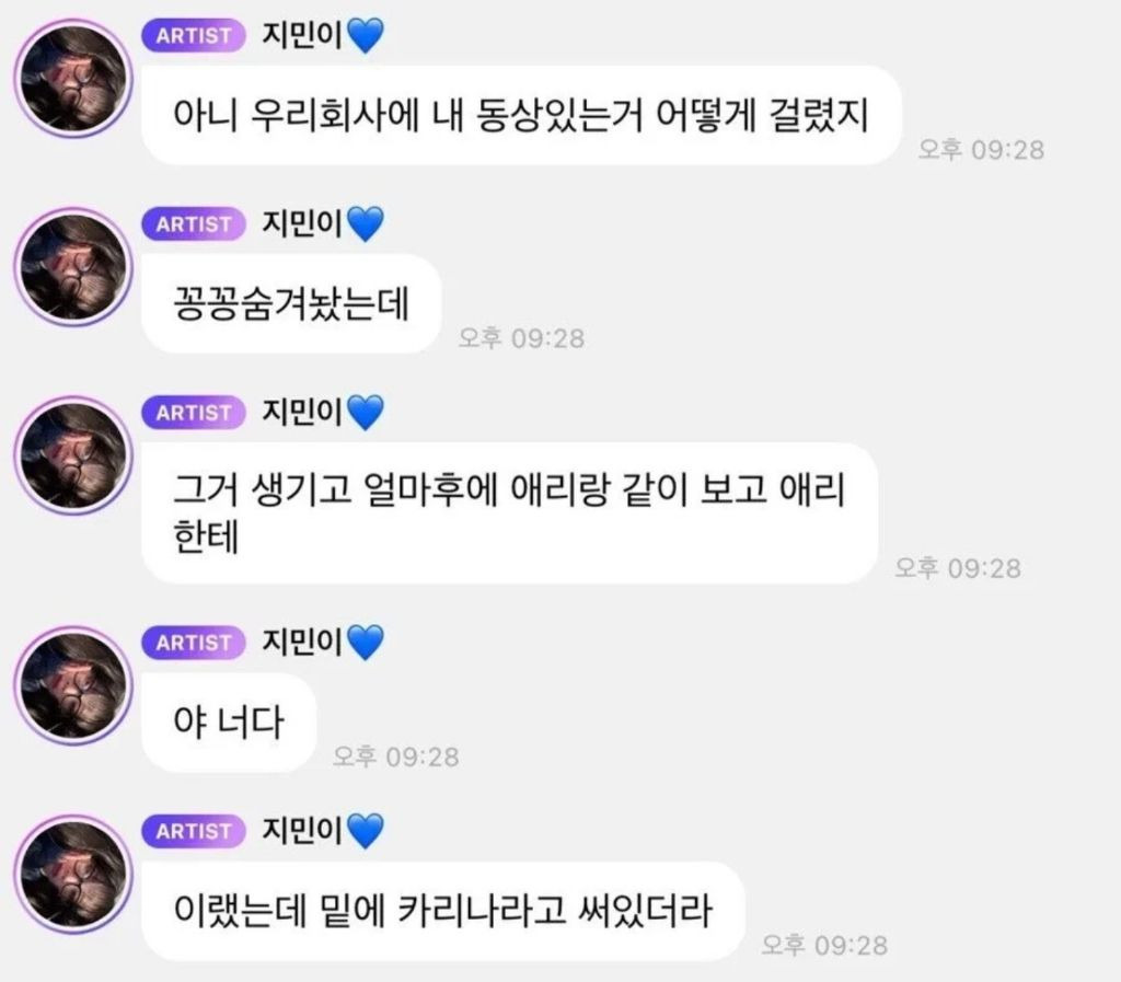 이 정보를 공개한 ARTIST 지민은 비밀리에 동상을 보관하고 있었다고 한다. 지민은 오후 9시 28분, 자신이 동상을 숨겨놓았던 사실을 소셜미디어에 올리며 “우리 회사에 내 동상이 어떻게 걸렸지?”라고 의문을 제기했다. 지민은 이후 카리나 동상 을 발견한 순간, 함께 있던 동료 애리에게 “너야”라고 외치며 깜짝 놀랐다고 전해진다.