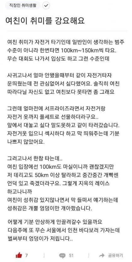 이제 남자는 다음주 또 다른 지옥의 레이스를 걱정하고 있다. 서울에서 인천 바다를 보러 가자는 여친의 초대에 벌써부터 엉덩이가 아프다고 호소하며, 과연 그의 고생이 끝날 날이 올까? 7 51, 변화 없는 이 고통은 계속될 것인가?