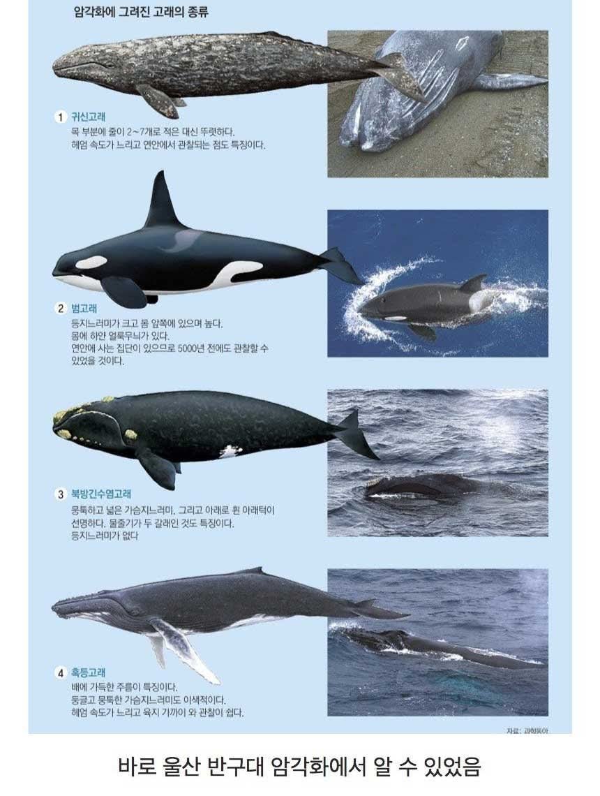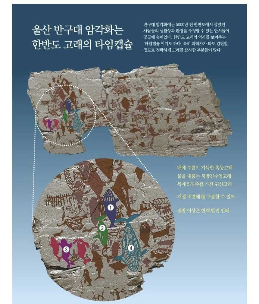 그리고 울산의 반구대 암각화! 이곳은 5000년 전 한반도 사람들의 생활상을 보여주는 뉴스의 전환점이 된다. 고래를 정확하게 묘사한 이 암각화는 고래의 종류에 대한 정보를 엄청나게 제공해주고 있다. 특히 과학자들이 감탄할 정도로 세밀하게 그려진 고래들이 벌써부터 한반도 바다에서 살고 있었음을 증명하는 타임캡슐과도 같다.