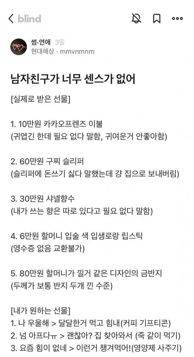 남자친구의 센스 없는 선물 때문에 여자친구가 대혼란에 빠진 상황이 포착됐다! 지난 3일, 한 블라녀가 SNS에 올린 글이 큰 화제를 모으고 있다. 그녀는 남자친구가 준 선물들이 자신의 취향과는 괴리감이 있다고 폭로하며, 충격적인 선물 목록을 공개했다.
