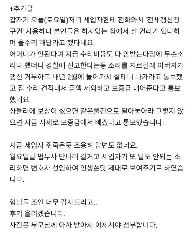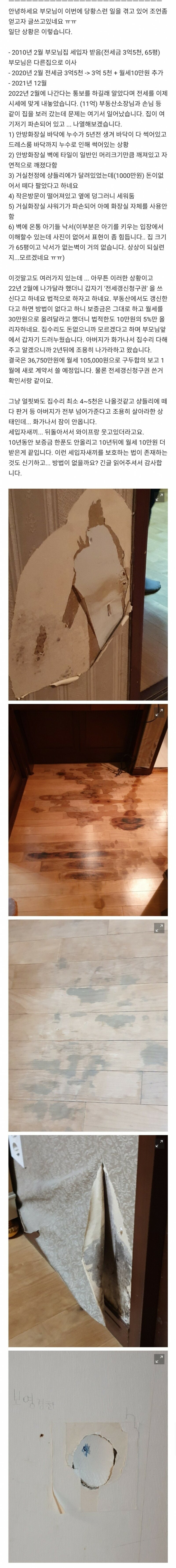 전세금이 3억5천만 원에서 월세 10만 원으로 추가된 이후, 세입자는 자신이 2022년 2월에 나간다고 통보했다. 부모님은 즉시 시세를 반영하여 집을 11억 원에 내놓았고, 부동산 소장님과 함께 집을 보러 간 순간, 그야말로 경악하지 않을 수 없었다.