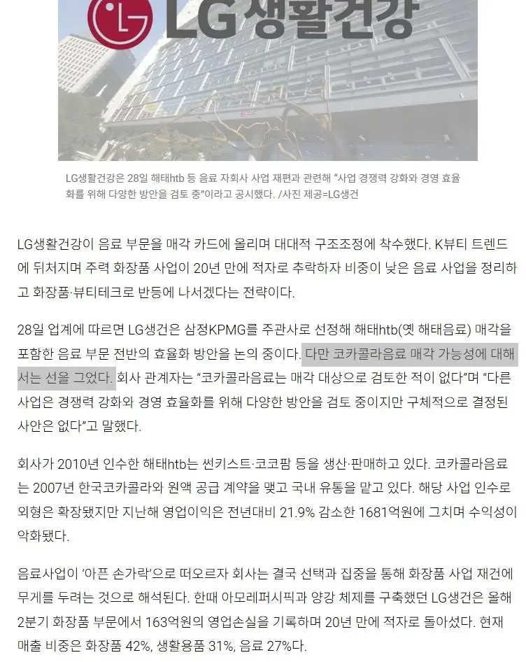 LG생활건강이 음료수 사업 매각을 검토하면서 업계의 이목이 집중되고 있다. 해태htb와 같은 음료 자회사를 정리하며 대대적인 구조조정에 착수한 LG생건은 K뷰티 트렌드에 뒤처지며 화장품 부문이 20년 만에 적자로 전락하자, 비중이 적은 음료 사업을 정리하고 화장품 및 뷰티테크로의 반등을 꾀하겠다는 파격 전략을 내세우고 있다.