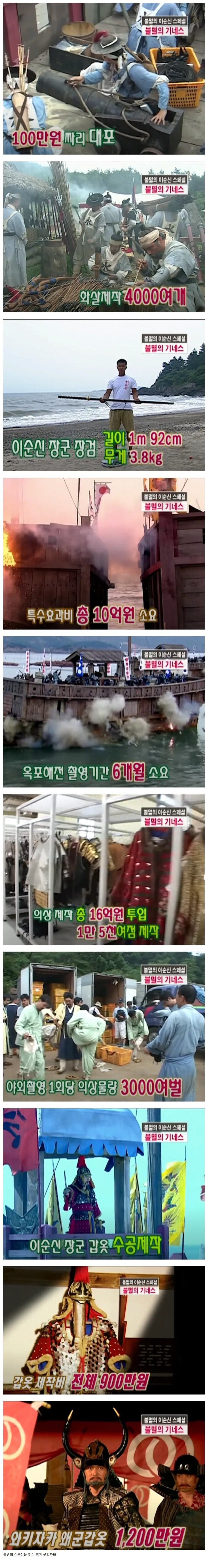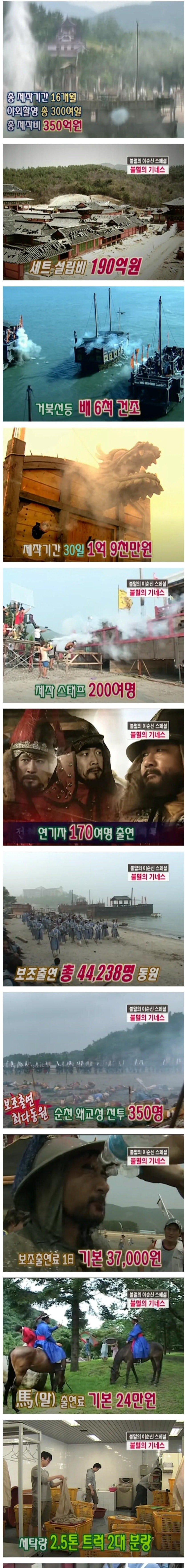 그런데 여기서 끝이 아닙니다! 거북선 모델 제작에만 30일과 1억 9천만원이 들어갔고, 이 총체적 제작 과정에는 200여명의 스태프와 170명의 연기자가 참여했으며, 보조출연자 수는 무려 44,288명에 이릅니다. 그런가 하면, 순천 왜교성 전투의 재현에는 350명의 보조출연자가 동원되었으며, 이들에게 지급된 출연료는 기본적으로 37,000원이었습니다. 심지어 말의 출연료는 24만원에 달하죠!