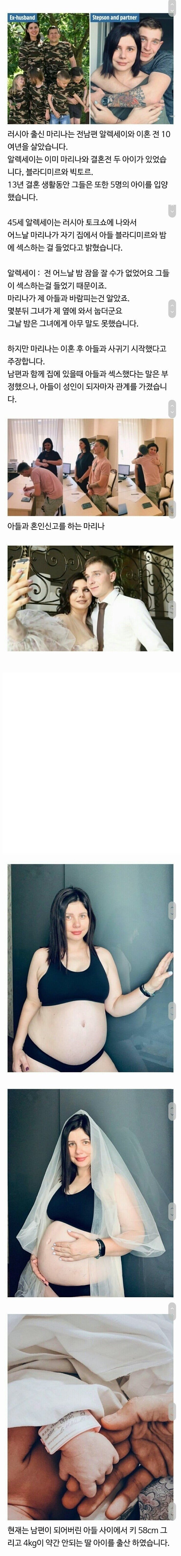 35세의 마리나가 놀라운 이야기를 하나 공개했습니다. 그는 전 남편 알렉세이와 10년간의 결혼 생활을 마무리한 후, 전 남편의 아들 블라디미르와 사랑에 빠졌다고 주장하는데요. 두 사람의 나이 차이는 무려 25년입니다! 마리나가 블라디미르를 처음 만난 건 그가 7살이었을 때로, 그녀는 13년 동안 그를 키워온 엄마다운 역할도 수행했던 것입니다.