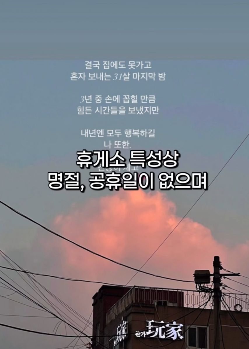 그리고 이 모든 과정을 소화하는 그는 “경리”가 아닌 마치 “잡부”와 같다며 허탈한 웃음을 짓는다. 결국, 집에 돌아가지도 못하고 혼자 밤을 지새워야 하는 그의 마지막 31세의 하루는 참담하다. 그가 바라는 것은 내년엔 모든 것이 행복해지길, 그리고 그를 힘들게 했던 모든 시간이 잊혀지길 바라는 것이다.