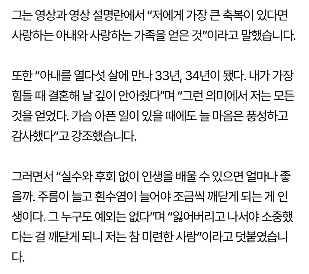 그는 영상에서 "저에게 가장 큰 축복은 사랑하는 아내와 가족을 얻은 것"이라고 고백하며, 아내를 15세에 만나 33년이 넘는 세월을 함께했다고 전했다. 결혼 당시 힘든 시간을 함께 해주었던 아내에 대한 감사의 마음을 드러내며, 자신이 인생에서 진정한 행복을 찾았다고 주장했다.